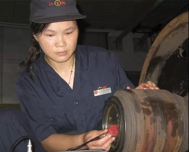 干一行、钻一行,不断探索攻关,解决技术难题。2007年6月27日,江岸车辆段检修车间接到探伤第一批压装了德国(BVV)车轮的轮对的任务,根据铁道部规定,除按正常的轮对探伤工艺要求对BVV车轮的轮对探伤外,还需要对BVV车轮进行辐板部位的磁粉探伤检查、对轮辋和轮毂两端面进行超声波探伤检查、以及对轮对踏面进行径向超声波探伤检查。为确保探伤质量合格,她根据《德国车轮复检探伤培训教材》并结合以往探伤经验,配合技术科详细制定了《德国车轮辐板磁粉探伤工艺》、《德国车轮轮辋部位、轮毂部位以及踏面超声波探伤工艺》,为该段检修车间对德国车轮探伤检查制定了依据,从而保证了德国车轮的检修质量。通过论证研究,她提出将轮对超探机中的三晶片组合探头改装成能单个更换的组装探头,得到厂家地认可,仅此一项为铁路车辆探伤行业节省资金70多万元。2012年12月,新更换的轮对超声波自动探伤机由于设计缺陷,在轮对探伤完成后需要探伤工手动将探伤完成的轮对推出探伤机,极大地加强了作业强度,她向设备厂家建议设计液压顶杆,使设备能够在轮对作业完毕后自动推轮,得到了厂家专家的认可,并立即进行设备改造,既符合探伤要求,又减轻了作业强度。