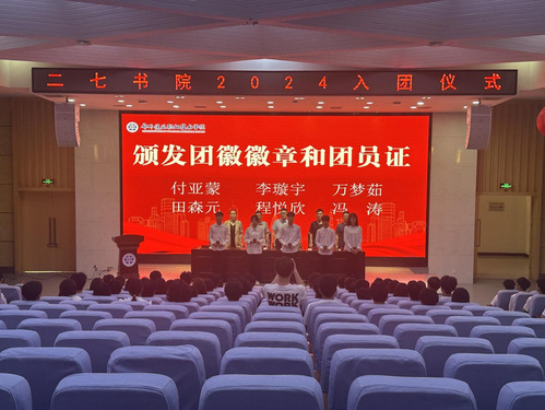 团结奋进新征程,同心奋斗创伟业。5月20日下午5点20分,二七书院在新校区第二报告厅举行2024年新团员入团仪式,以我初心,向党告白,爱党爱国、爱团爱校。二七书院党总支书记、院长郭晓斌,党总支副书记朱纹玉,党总支副书记吕蒙,学工办主任、团总支书记吉海洋出席本次活动。优秀团员代表、全体新团员参加会议。会议由团总支副书记胡宪丽主持。