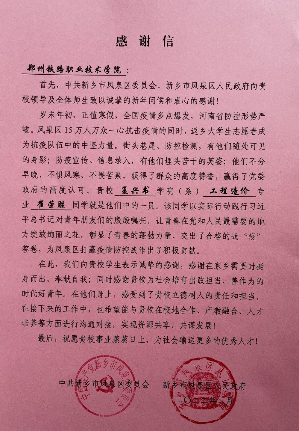 复兴书院工程造价20A2班的崔荣胜同学,相应政府和书院号召,参与到社区防控检测、防疫宣传、信息录入等工作中,确保社区疫情防护工作高质量的进行。崔荣胜同学不分早晚、不惧风寒、不畏苦累的工作态度获得了家乡群众的高度赞誉,赢得了当地党委政府的高度认可,并向学校发来感谢信。