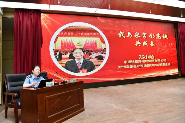 郑小燕是党的二十大代表,曾先后获最美铁路人、全国铁路巾帼标兵、河南省劳动模范、河南省五一巾帼奖章、河南省五一劳动奖章、国铁集团新时代铁路榜样、国铁集团火车头奖章等荣誉称号。报告会上,党的二十大代表郑小燕结合自身成长经历,以“我与米字形高铁共成长”为题,从“时代给予我成长发展的好机遇”“努力才能不辜负这个时代”“每个人都可以创造属于自己的小时代”等方面,分享了个人成长经历,勉励大家用奋斗成就出彩人生。