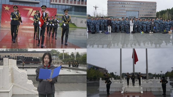伴随着秋雨缠绵,广场上气氛庄严肃穆,国旗护卫队队员们身着整齐的制服,迈着坚定有力的步伐,护送着鲜艳的五星红旗走向升旗台。 伴随着激昂的《义勇军进行曲》,五星红旗在全体师生的注目下缓缓升起。师生们肃立敬礼,高唱国歌,表达着对祖国的无限热爱和深深祝福。那一抹鲜艳的红色在风中飘扬,如同燃烧的火焰,点燃了每个人心中的爱国热情。