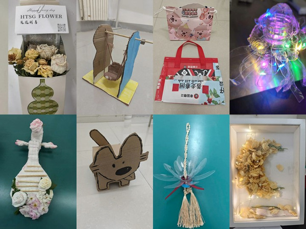 活动中,同学们充分发挥奇思妙想,用灵巧的双手赋予旧衣物、塑料瓶、废纸箱等常见废弃物品全新的生命。废旧纸箱在同学们的精心折叠下,摇身一变成为憨态可掬的简易小狗;透明的塑料瓶经过改造,化身为散发着柔和光芒的精美灯花;枯萎的花朵被巧妙装裱,定格成别具韵味的艺术相框;奶茶袋也不再被随意丢弃,而是被改造成了实用的卫生纸盒。每一件作品都凝聚着同学们的巧思,是对 “变废为宝” 理念的完美诠释。正如一位参与活动的同学所说:“这次活动让我大开眼界,原来被当作‘垃圾’丢弃的物品,经过改造竟能变成如此实用的东西。在动手创作的过程中,我对循环利用有了更深刻的认识。”