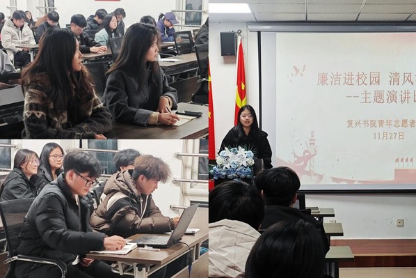 为引导青年志愿者树立廉洁自律的价值观念,筑牢校园廉洁根基,涵养崇廉尚洁的品格,2025年11月18日,复兴书院青年志愿者协会在复兴大讲堂成功举办“廉洁进校园,清风润人心”主题演讲比赛。书院师生代表齐聚一堂,共同感受廉洁文化的深厚底蕴与独特魅力,推动廉洁之风吹遍校园每个角落,以清风正气滋养师生心灵。