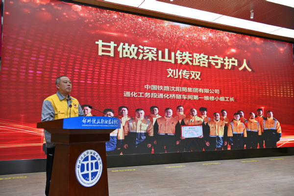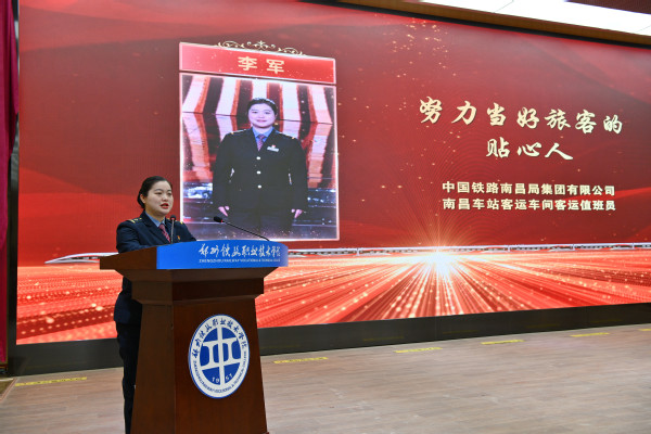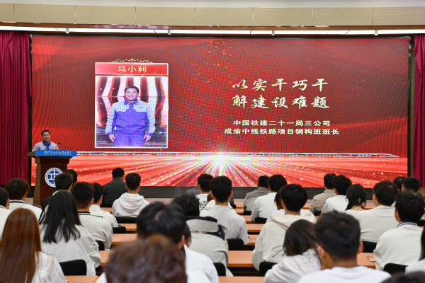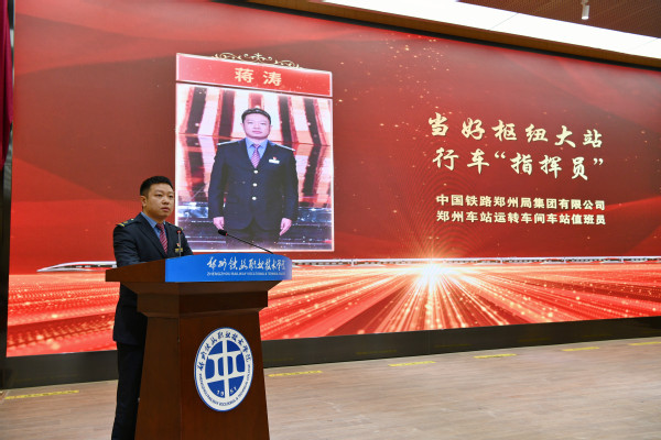 报告会上,4位2023年“最美铁路人”、1位中国铁路郑州局集团有限公司“2023·星耀家园年度榜样”身着不同的岗位制服,依次上台作先进事迹报告。他们中有努力当好枢纽大站行车“指挥员”的中国铁路郑州局集团有限公司郑州车站运转车间车站值班员蒋涛、努力当好旅客贴心人的中国铁路南昌局集团有限公司南昌车站客运车间客运值班员李军、甘做深山铁路守护人的中国铁路沈阳局集团有限公司通化工务段通化桥隧车间通化桥隧第一维修小组工长刘传双、以实干巧干解建设难题的中国铁建二十一局集团三公司成渝中线铁路项目钢构班班长马小利、让青春在大山深处绽放的中国铁路郑州局集团有限公司月山工务段西武匠线路车间孔庄维修工区工长牛少雄。5位报告团成员以朴实无华的语言,从不同侧面、不同角度介绍了他们的感人故事和奋斗精神,他们的先进事迹和精神面貌充分展现了新时代铁路人的先行风采、服务本色、担当品格和奋斗精神,向全社会传递了铁路榜样正能量,让在场的师生深受感染、热泪盈眶,不时响起热烈的掌声。