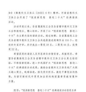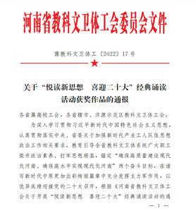 河南省教科文卫体工会举办的“悦读新思想 喜迎二十大”经典诵读比赛采用线上方式进行,激励全省教职工团结一心、砥砺奋进,为迎接党的二十大胜利召开营造氛围,为谱写新时代中原华章贡献出智慧和力量。我校参赛教师精心组织,以饱满的热情和良好的表现力取得了优异成绩,为学校赢得了荣誉,展现了我校教师良好的精神风貌。