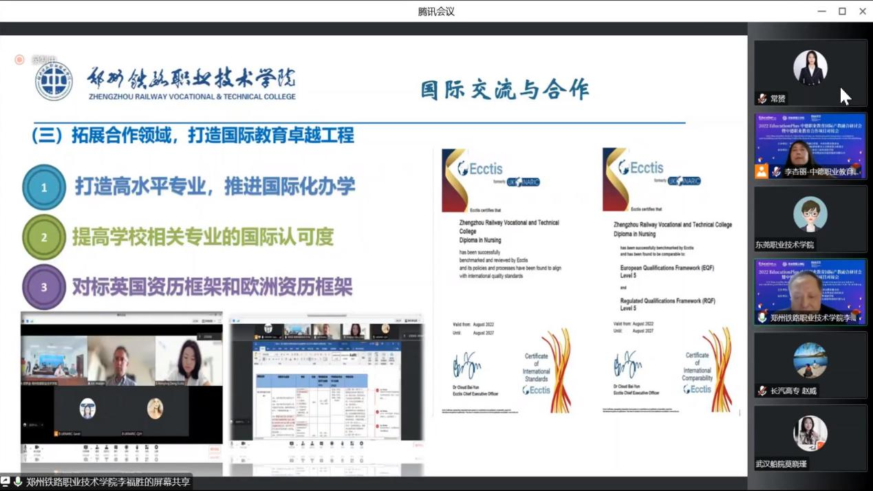 李福胜简要介绍了学校的基本情况,并通过中外合作办学、国际合作领域、跨境教育、参与国际事务等几方面分享了我校在高等职业教育国际化办学中的实践与思考。他表示,近几年,学校始终坚持“引进来”“走出去”共同发展,探索创新跨境教育新模式,积极承担海外技术技能培训、中外人文交流项目,贡献中国职教方案、传播中国传统文化,打造“郑铁”职教国际品牌。