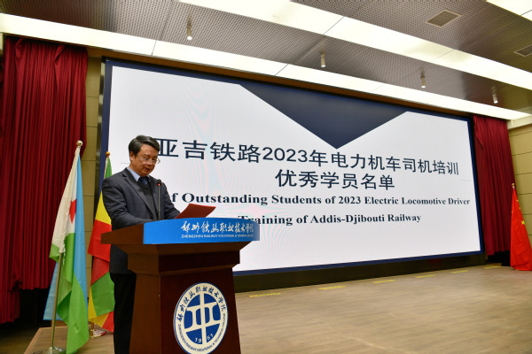 12月18日,mg娱乐电子游戏官网举行亚吉铁路2023年电力机车司机培训结业典礼。学校党委书记田道敏、校长马玉霞、副校长倪居,中国铁路郑州局集团有限公司郑州机务段副段长刘连成、埃塞俄比亚—吉布提标准轨距铁路公司首席技术官英格·丹尼尔、亚吉铁路运营和维护项目公司副总经理王新军,学校相关部门负责人,和教学、管理团队以线上线下的形式参加了活动。结业典礼由副校长倪居主持。
