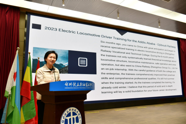 马玉霞首先代表学校向全体学员表示热烈祝贺。在致辞中指出,6个月的培训期间,学员们系统学习了机车构造、机车检修、安全运行和乘务作业方面的理论知识,还前往中国铁路郑州局集团有限公司开展了跟车实习。在校企双方的悉心教导下,学员们的岗位知识、实操技能、职业综合素养都得到了全面提升,为学员们今后职业发展奠定了坚实基础。学校祝愿学员们成为铁路事业上的佼佼者、赓续中非友谊的推动者,为当地社会经济发展作出应有贡献。马玉霞表示,今年是共建“一带一路”十周年,也是埃塞俄比亚和吉布提两国轨道交通事业高速发展的十周年。10年来,我们见证了亚吉铁路给东非地区带来的巨大变化,也见证了中非人民结下的深厚友谊。