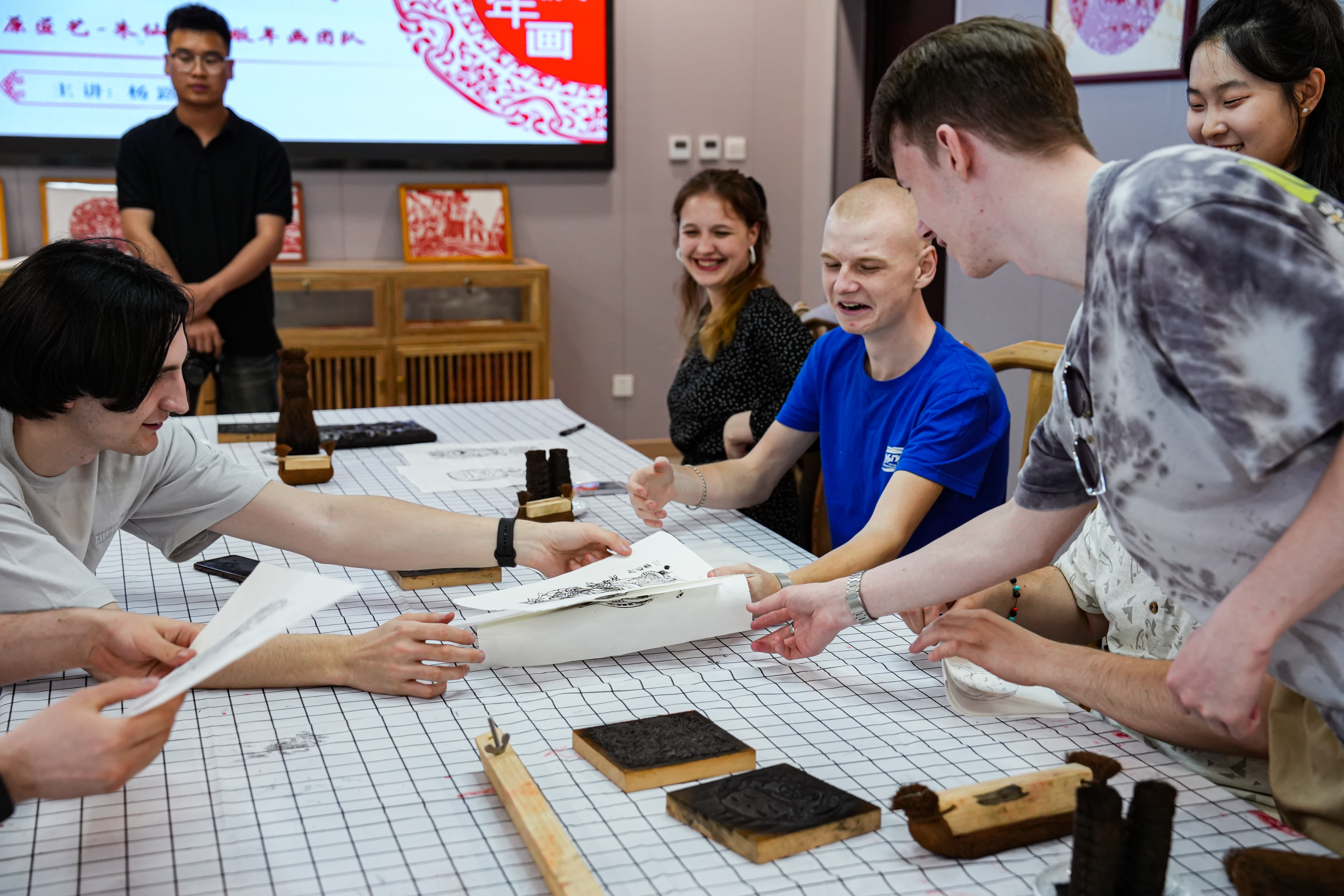 5月7日,来自乌拉尔国立交通大学的9名俄罗斯留学生走进我校科创楼朱仙镇木版年画工作室,体验朱仙镇木版年画制作技艺。