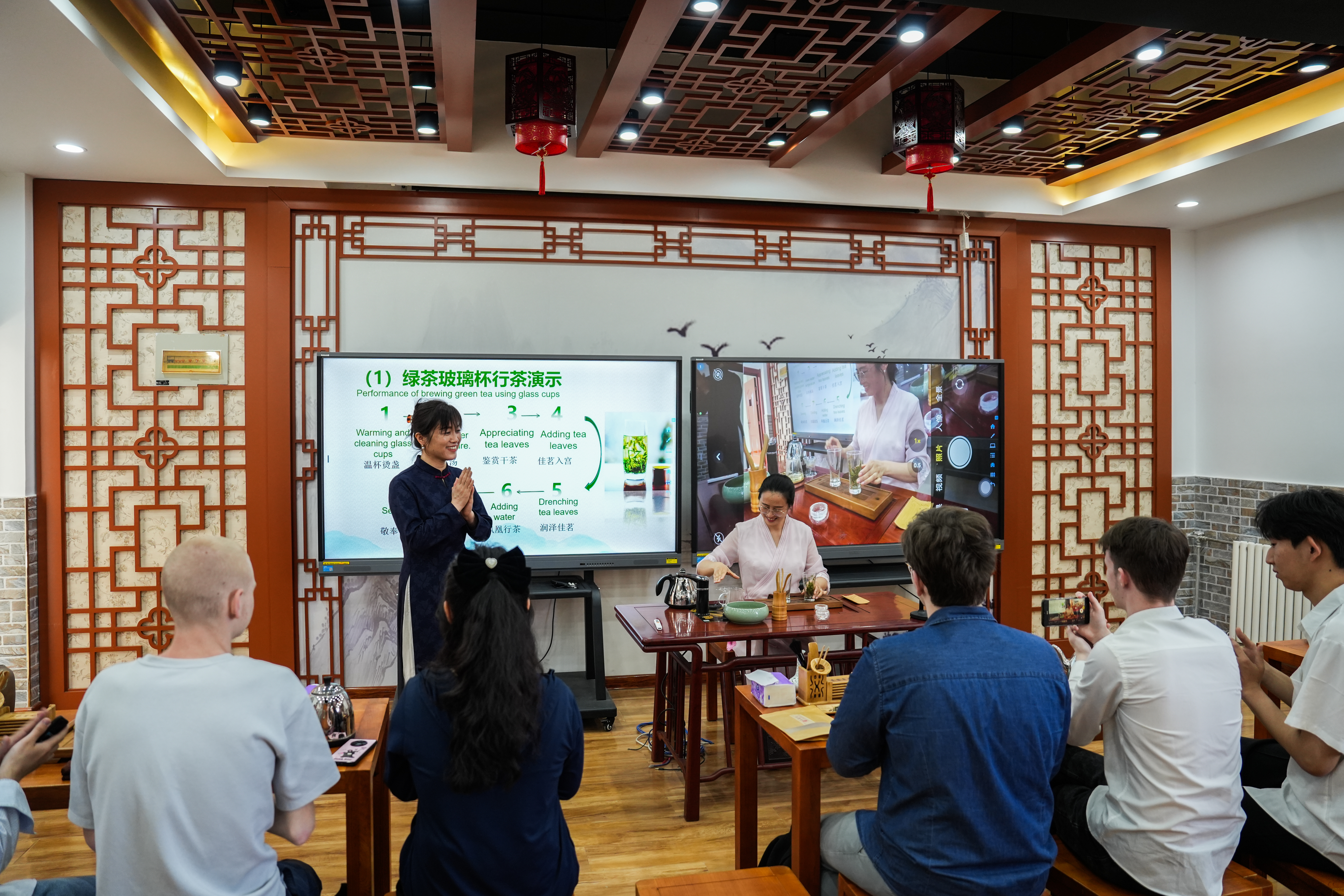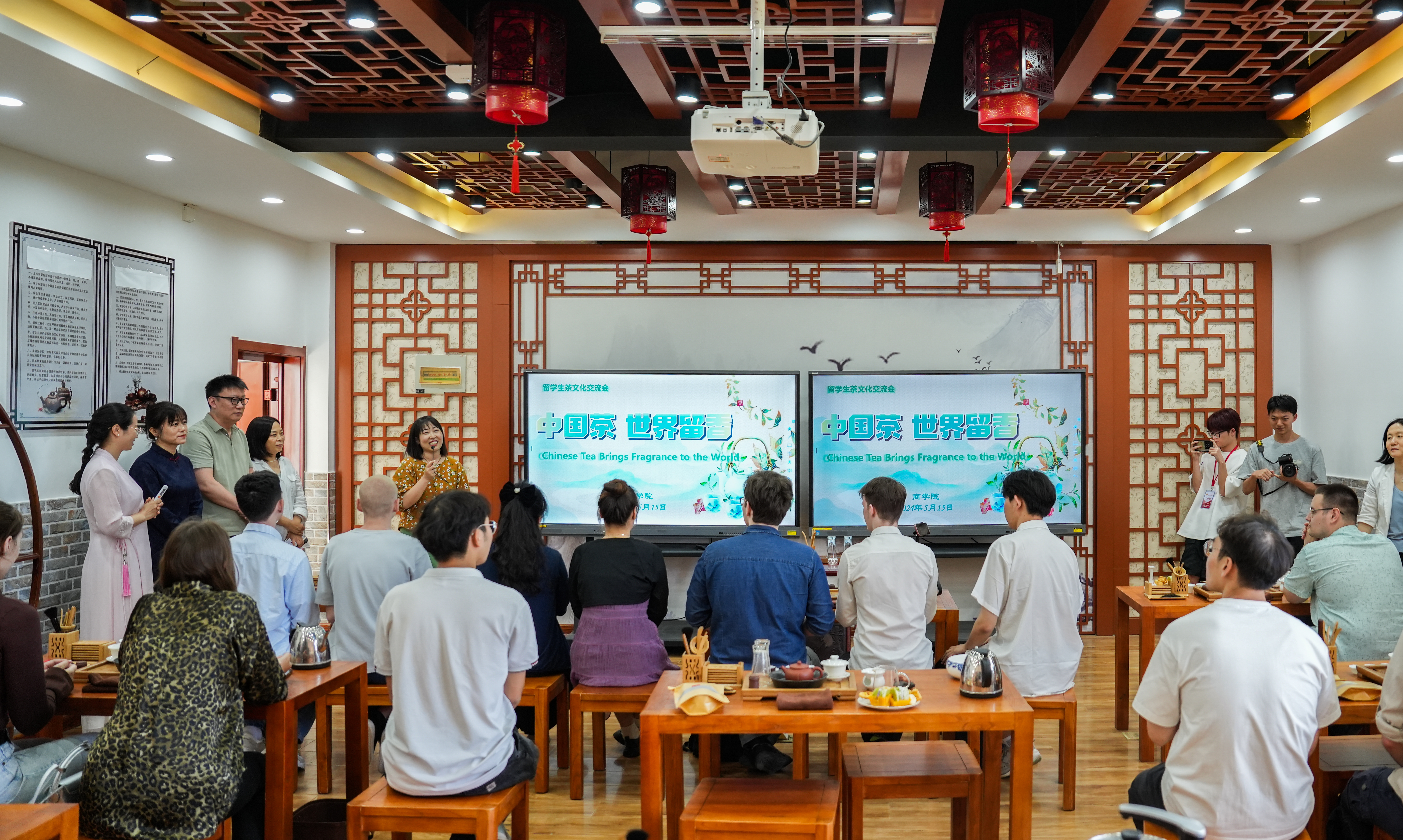 在实训室,商学院教师田露、吴琳向留学生系统讲解并展示了中国茶叶的分类、茶叶独特的风味和冲泡方法,以及茶叶所承载的历史和文化。