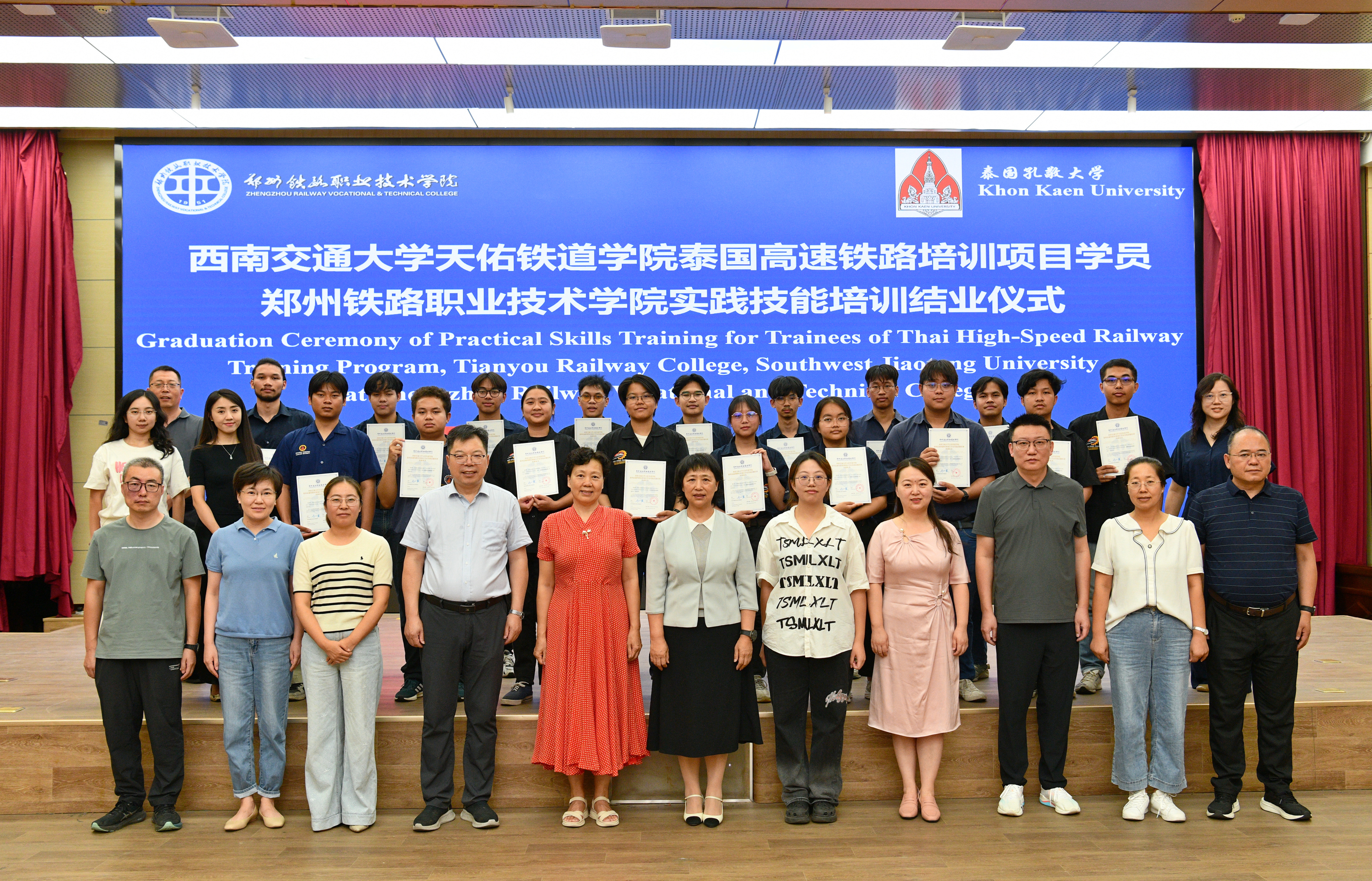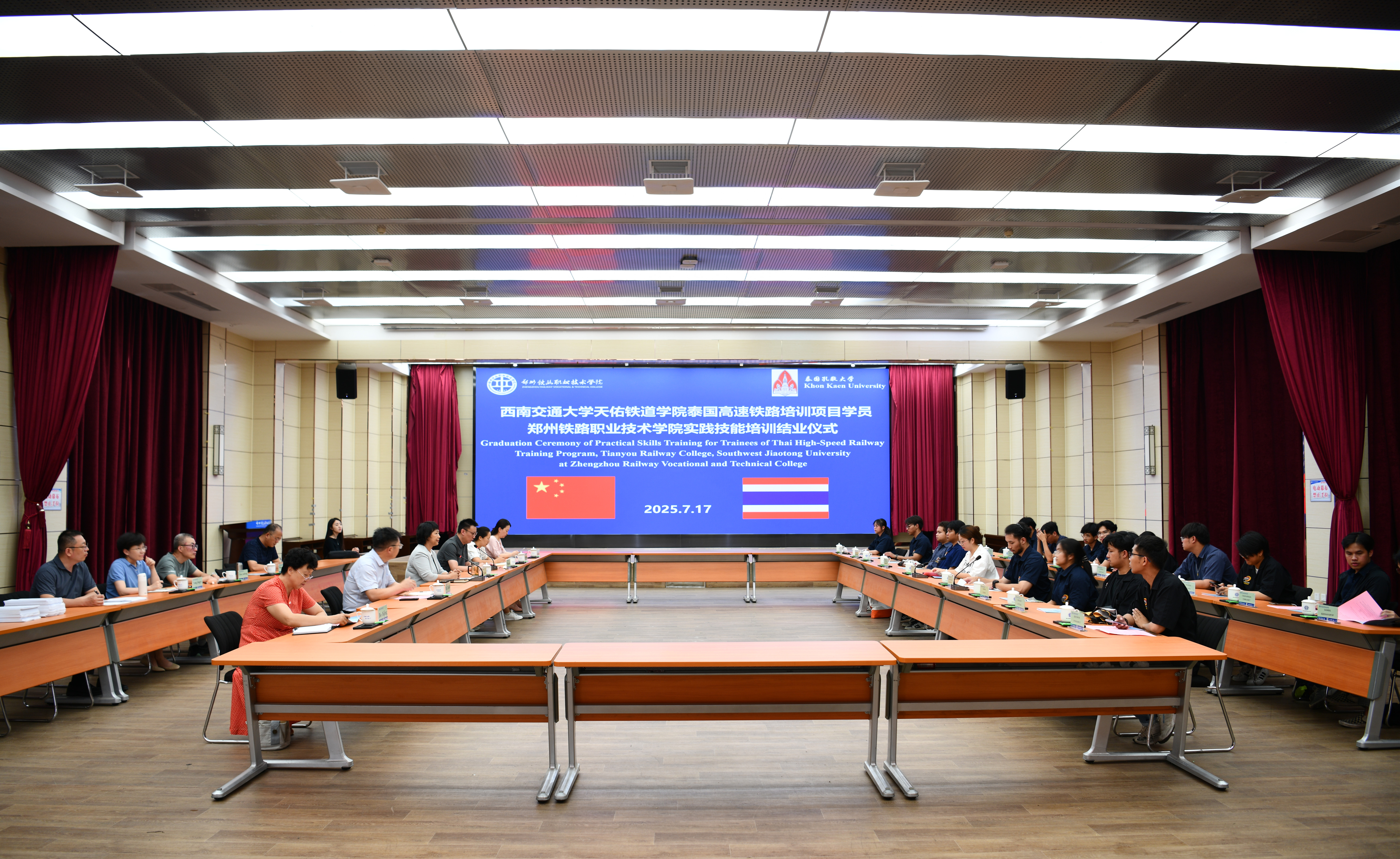 7月17日,mg娱乐电子游戏官网举办泰国孔敬大学留学生高速铁路实践技能培训结业典礼。学校副校长陆艳琦出席活动。相关职能部门和二级学院负责人,17名泰国孔敬大学留学生参加活动。