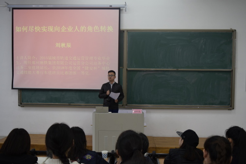 2019年3月28日,运输管理学院党总支举办“开讲啦”系列活动——“工匠精神”优秀毕业生讲坛。此次讲坛特邀请郑州地铁集团有限公司站务中心站务二室值班站长刘秋辰为大家开讲。运输管理学院党总支书记王冬、党总支副书记刘斌以及无课党员教师出席。会议由组织员崔琬茹主持。 在崔琬茹做了刘秋辰站长的短暂介绍之后,刘秋辰站长以“如何尽快实现向企业人的角色转换”为主题,向大家分享了自己的大学经历以及从工作中得出的经验和感悟,针对“工匠精神”提出要多角度、全方面的塑造自身的工作技能,并与同学们互动,帮助大家解答一些就业上的疑问。随后张晓玲老师针对刘秋辰的开讲给予一些补充,对就业压力大的问题提出自己的观点,表示无论什么时候努力学习工作都不晚,有付出就有收获。最后,王冬书记对此次讲座做出总结,告诫同学们要对自己负责,做一个有心人,有反思能力、行动能力的人,要善于吸取他人的长处、化为己用,并祝愿同学们将来都能有所作为。 此次开讲拉开了运输管理学院“工匠精神”优秀毕业生讲坛的序幕,既结合专业背景丰富了党总支主题党日活动的形式,又有助于进一步激发师生党员立足岗位话奋斗,并为学生的成长成才打下坚实的基础。