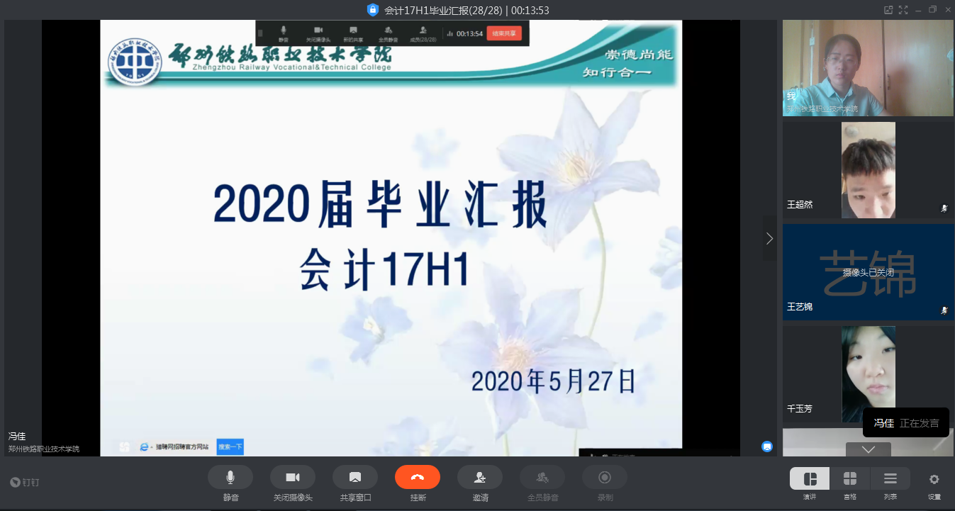 5月27日至28日,2020届会计、会计(交通运输方向)、会计(中澳合作)专业95名毕业生,通过网络在线方式进行了毕业实习汇报,运输管理学院财会教研室全体教师全程参与。 在疫情防控形势下,充分考虑所有学生的实际情况,针对未能参与实习的学生,学院领导和教研室主任、专业教师们共同探讨、认真细致地制定了《2020届会计专业毕业设计实施方案》,引导学生积极准备并制作完善各自的毕业设计内容。