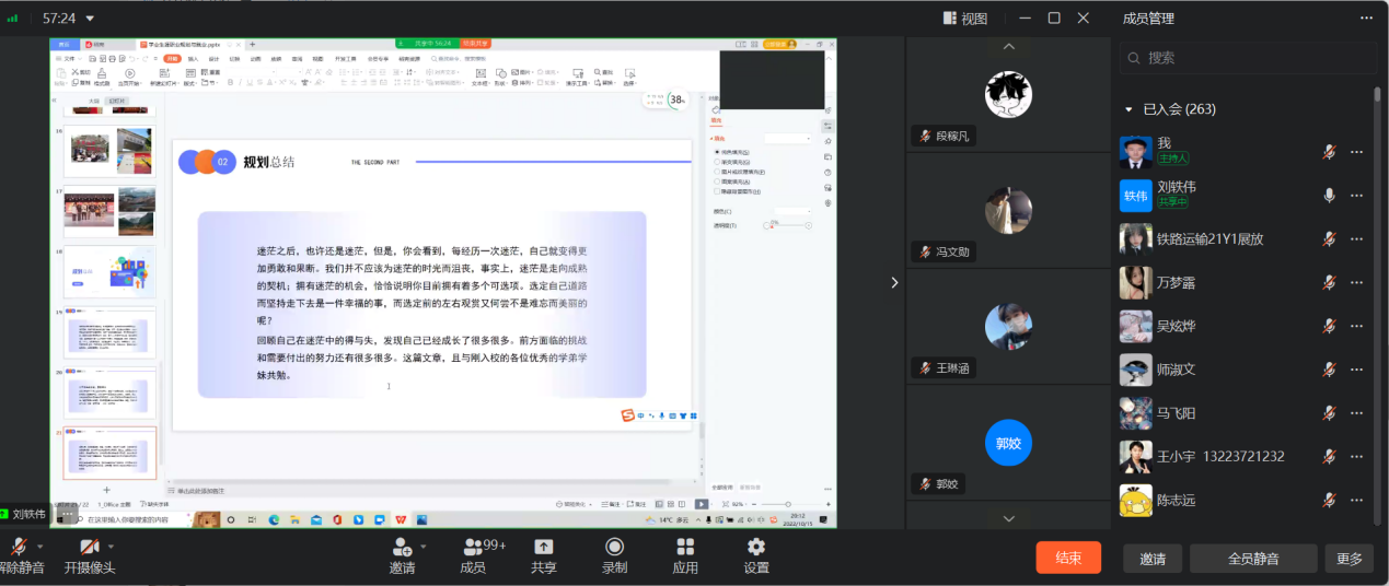 10月15日,为丰富铁路运输专业学生课余生活,深化各位同学对本专业的基本认知,运输管理学院举办“学业生涯规划”优秀毕业生讲坛。铁路运输专业邀请了郑州局集团有限公司长治北车站毕业生刘轶伟,通过线上交流的方式,与大家分享互动。 主持人刘轶伟结合自身,向大家分享了自己的大学经历以及从工作中得出的经验和感悟,对自我认知、确定目标、具体措施、规划总结等四个方面,为同学们今后如何确立学业生涯目标打下坚实的基础。 此次开讲作为运输管理学院“学业生涯规划”优秀毕业生讲坛的专题活动,明确了同学们对学业生涯的迷茫,更好的帮助大家今后有效地处理学习和生活之间的问题,坚定信念,不负韶华。