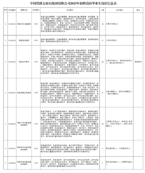 根据企业发展需要,现将2025年全日制普通高等职业院校高职(大专)毕业生招聘有关事项公告如下: 一、招聘计划 本次计划招聘136人,招聘岗位、学历、专业、人数和工作地点等内容详见《招聘岗位信息表》。 二、应聘条件 (一)品行端正,遵纪守法,诚实守信,身心健康,成绩优良,勤奋上进,热爱铁路事业。 (二)2025年毕业,列入国家招生计划,按期取得毕业证的全日制普通高等职业院校高职(大专)学历毕业生;符合国家政策要求的离校未就业毕业生以应届毕业生身份参加应聘。 (三)就读院校生源及教学质量较好,须开设有铁路特色专业,所学专业为铁路专业方向,所学课程为铁路主专业课程。 (四)须符合招聘岗位要求的学历、专业等条件,辨色力正常、双眼矫正视力不低于5.0,具有良好的身体条件和心理素质;适应长期在铁路沿线、偏远山区、艰苦环境地区工作及户外、野外、轮班、夜班作业要求,服从我公司对岗位的安排和调整。 (五)工作单位所在地生源优先。 三、招聘流程 (一)简历投递。登录“太铁招聘”(https://www.crtyhr.com)注册,按照“简历投递须知”要求真实、准确填写基本信息,将所要求的求职材料清晰扫描,压缩在一个完整压缩包内,上传。简历投递每人限选一个岗位,信息填报、修改共三次机会,锁定后无法修改。简历投递完成后,请及时在“太铁招聘”下载打印《高等院校毕业生招聘申请表》。本次招聘仅接受应聘毕业生本人通过“太铁招聘”平台投递简历,不接受其他方式报名。 (二)资格审查。我公司将根据岗位需求、学历、专业、生源条件、岗位适配度等要素,分期分批进行资格审查,择优筛选符合岗位要求的毕业生参加后续招聘环节。 (三)考试考核。根据资格审查情况,分期分批进行考试考核,同步进行求职材料等重点项目现场审核和确认,具体时间、地点及方式另行通知。 (四)公示签约。对应聘人员有关情况进行复审,综合考试考核等情况,形成拟录用人选。通过“中国铁路人才招聘网”或“太铁招聘”对拟录用人员进行公示,签署就业协议书。 四、应聘须知 (一)简历投递时间:2025年5月28日至6月6日。 (二)简历投递期间工作日9:00-11:30、15:00-17:30开通电话0351-2622289,接受应聘者本人咨询。非咨询时间、非咨询电话无法受理咨询,敬请谅解。 (三)应聘人员应按要求参加招聘活动,因通信不畅等原因导致未按要求参加或延误的视为放弃。对未进入下一招聘环节的,不再进行单独通知,敬请谅解。 (四)资格审查、诚信审查等贯穿招聘录用全过程。应聘人员应自觉遵守招聘纪律、维护招聘秩序,秉承诚实守信原则,对基本信息、简历内容、考试考核的真实性、有效性、准确性和完整性负责。如发现存在伪造剽窃、隐匿虚假、违反招聘纪律、扰乱招聘秩序、发表散布不实信息等行为,取消应聘、录用资格。 (五)中国铁路太原局集团有限公司不向应聘者收取任何费用,不指定辅导用书,不举办也不委托任何机构或个人举办任何形式的辅导培训班,请提高警惕,谨防冒名诈骗。 (六)我公司保留对本招聘公告及相关规定的最终解释权。