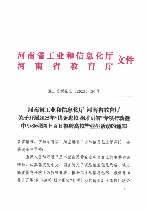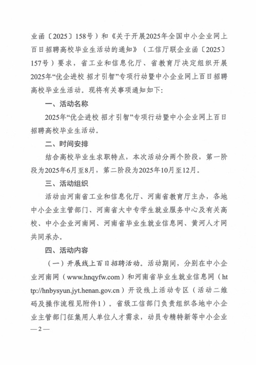 河南省工业和信息化厅、河南省教育厅关于开展2025年“优企进校+招才引智”专项行动暨中小企业网上百日招聘高校毕业生活动的通知