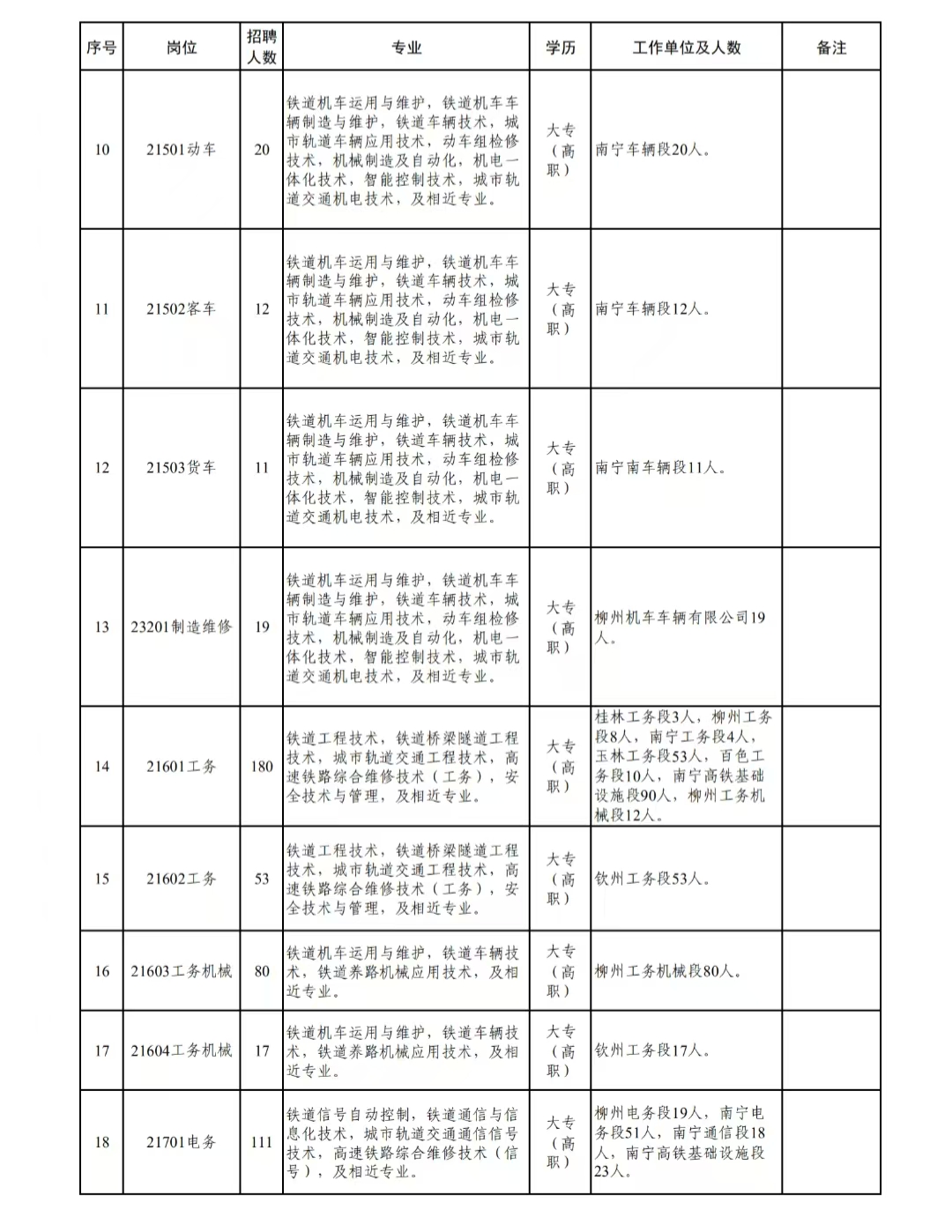 中国铁路南宁局集团有限公司根据企业经营发展需要,现公开招聘全日制应届普通高等院校大专(高职)毕业生,有关事项公告如下: 一、招聘岗位 本次计划招聘1191人,具体招聘岗位、专业、人数详见附件《中国铁路南宁局集团有限公司招聘2026年高校毕业生公告二岗位列表》。 二、报名条件 应聘毕业生应同时满足以下条件: 1.符合招聘岗位要求的专业条件,列入国家招生计划的全日制应届普通高等院校大专(高职)毕业生。在校期间所学专业方向为铁路专业方向或所学主要课程包含铁路专业课程。 2.遵纪守法,品行端正;热爱铁路事业,服从工作安排;能够适应偏远地区工作及夜班作业环境。 3.身心健康,无色盲色弱,具备正常履行岗位职责的身体条件,符合对应岗位要求和铁路行业职业健康检查规定,并以入职前单位组织的体检结果为准。 4.工作单位所在地生源优先。 三、招聘流程 1.网络报名。报名时间:2025年11月1日至2025年11月10日。应聘毕业生在规定时间内登录中国铁路人才招聘网进行网络报名,每人限报一个岗位。报名前准备好下列应聘材料: (1)学信网学籍在线验证报告、毕业生就业推荐表和成绩单(盖章原件)、本人居民身份证,以及其他能够证明本人资历、能力的材料; (2)体检报告。六个月内的二级甲等及以上医院常规项目体检表,其中血压、辨色力、视力、听力(纯音听阈测试)、心电图、胸片、血常规、尿常规、肝功能、肾功能、空腹血糖为必检项目。 应聘毕业生在报名时须上传学信网学籍在线验证报告、毕业生就业推荐表和成绩单(盖章原件)、本人居民身份证。上传材料须保证图像清晰可辨,同一材料涉及多页须合并为1张图片上传。体检报告和其他未列明的材料不必上传。 2.资格审核。根据应聘毕业生专业、岗位适配度等要素,开展网络筛选和现场审核,择优确定考试考核入围人选,应聘材料不全者审核不予通过。具体时间、地点另行通知。 3.考试考核。本次招聘采取先笔试后面试的方式分期分批组织。笔试主要考核行政职业能力,根据笔试成绩排名,按岗位招聘人数的3倍比例确定面试人选,如参加笔试人数达不到岗位招聘人数3倍比例的,则该岗位全员进入面试。考试考核具体时间、地点另行通知,未按时参加笔试或面试者视为放弃。 4.公示签约。根据各岗位面试成绩排名确定拟录用人员,通过中国铁路人才招聘网公示。其中,录用到广西沿海铁路股份有限公司下属的防城港车站、钦州车务段、南宁南机务运用段、钦州工务段、钦州电务段、钦州供电段、钦州房产生活段招聘岗位的毕业生,入职时与广西沿海铁路股份有限公司签订劳动合同。 四、注意事项 1.本次招聘通过网络报名的方式进行,不接受现场、上门、电话、传真、邮件等其他方式报名。应聘毕业生投递简历前请仔细检查核对,简历一经投递不能撤回和更换。 2.应聘毕业生须对填写的报名信息和提供材料的真实性、准确性、完整性负责,资格审查贯穿招聘全过程,如有资料不实,一经查实立即取消应聘及录用资格。 3.应聘毕业生要密切关注中国铁路人才招聘网站内消息和手机短信,错过任一招聘环节的,视为放弃应聘。招聘过程中,凡未进入下一环节者,不再单独通知,敬请谅解。 4.本次招聘不授权、不委托第三方组织招聘,不向应聘毕业生收取任何费用,不指定辅导用书,不举办也不委托任何机构或个人举办任何形式的辅导培训班,请应聘毕业生提高警惕,谨防受骗。 5.中国铁路南宁局集团有限公司人事部保留对本招聘公告的最终解释权。咨询电话:0771-2722731,咨询时间:9:00-12:00、15:00-18:00(工作日)。