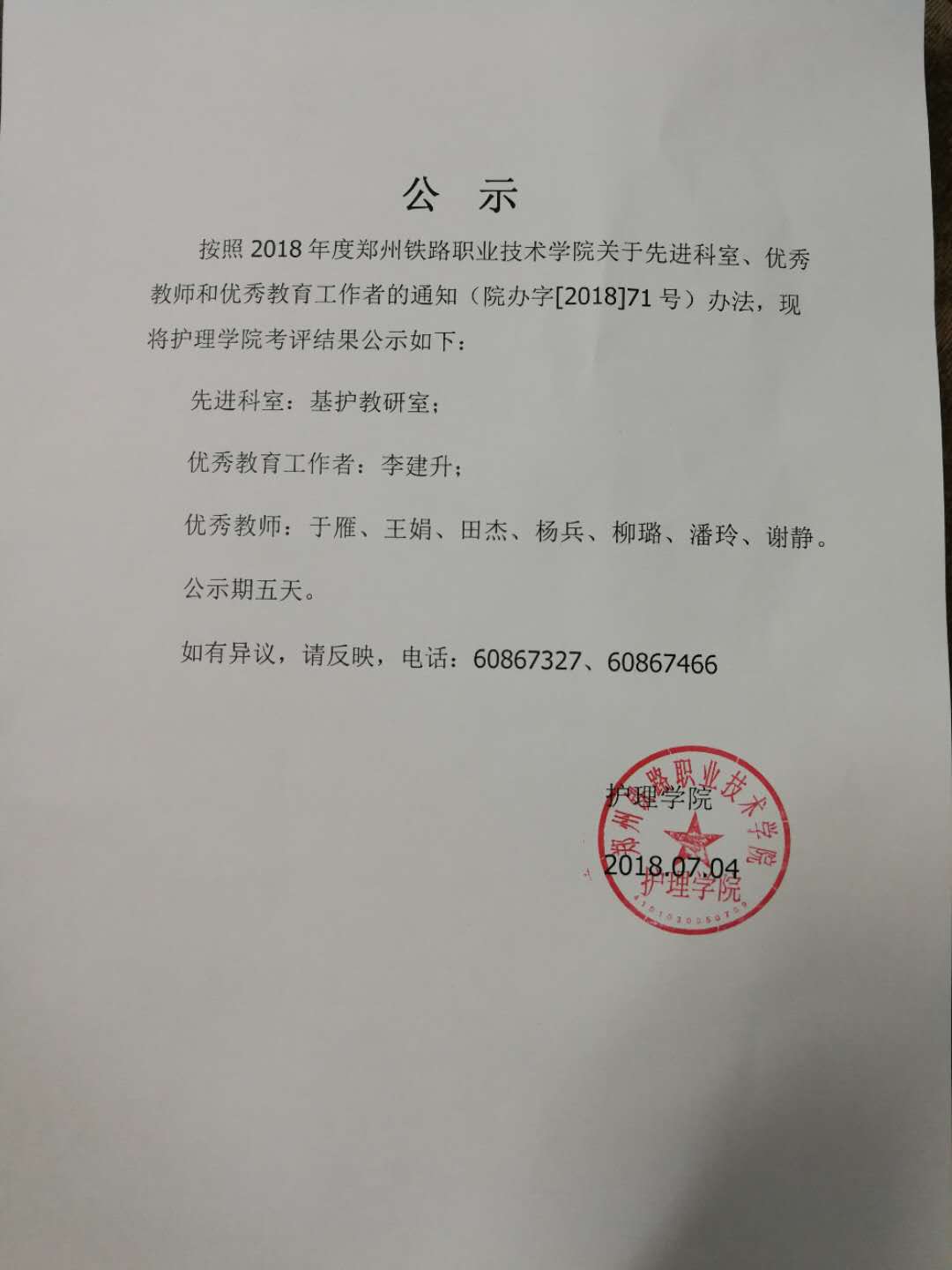 关于推荐2018年先进科室、优秀教师和优秀教育工作者的公示