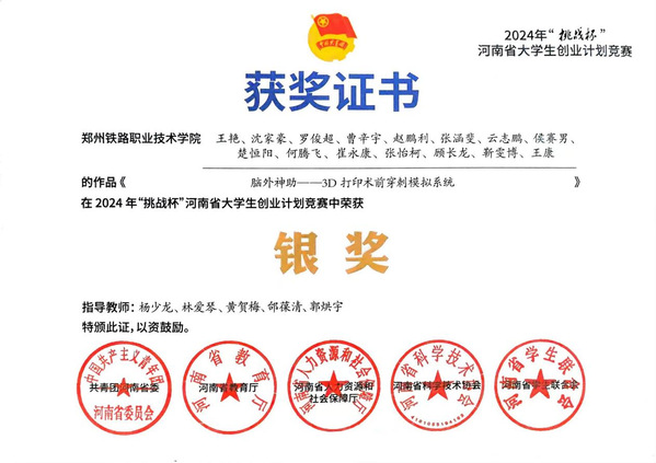 近日,在2024年 “挑战杯” 河南省大学生创业计划竞赛中,mg娱乐电子游戏官网护理学院的参赛团队凭借作品《脑外神助——3D 打印术前穿刺模拟系统》脱颖而出,喜获银奖,为学校创新创业成果再添浓墨重彩的一笔。