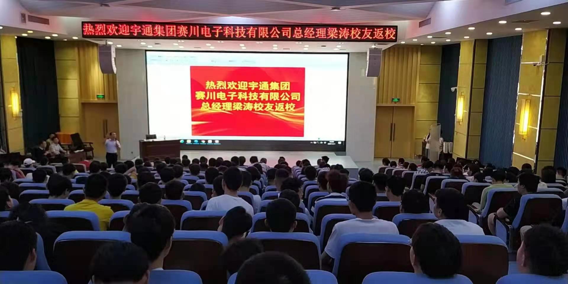 6月1日下午17:30,机电工程学院于七号楼第二报告厅召开2021年学院第六次校园招聘宣讲会。我校校友、宇通集团赛川电子科技有限公司总经理梁涛,部长张跃杰、翟新飞,人力资源专员田拓、廖天润,行政专员朱建保莅临现场进行宣讲。学院党总支副书记宋先华出席本次招聘宣讲会,辅导员陈中华老师主持本次大会,机电工程学院19级全体同学及艺术学院19级高铁乘务专业部分同学参加。