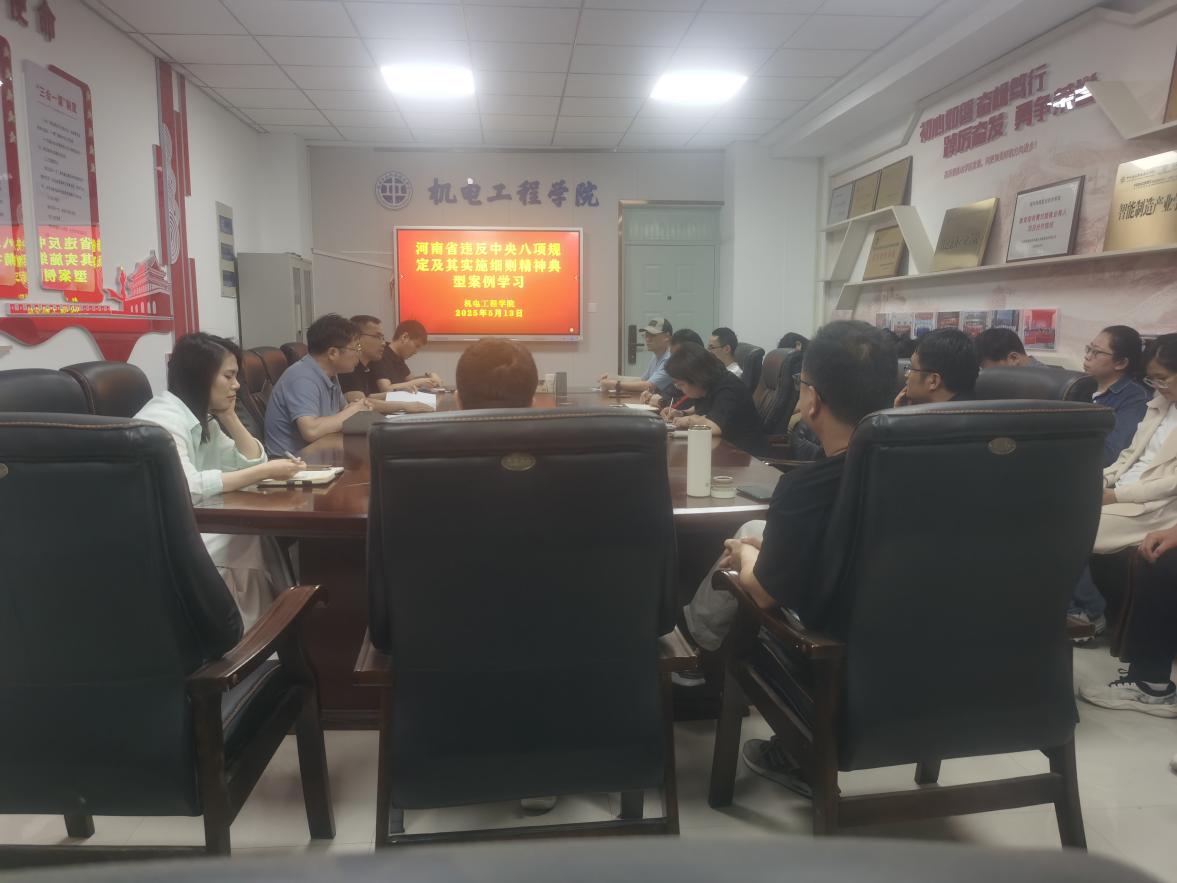 会上,机电工程学院党总支纪检委员通报了《河南省违反中央八项规定及其实施细则精神典型案例》。机电工程学院院长魏保立表示作为新时代制定的第一部重要党内法规,中央八项规定是中国共产党对自身建设的深刻反思和高度自觉,是对党的优良传统的传承和弘扬,是对人民群众期盼的积极回应;大家要以案为鉴,警钟长鸣,全体教职工特别是领导班子要认真查找自身在思想、作风、纪律等方面存在的问题和不足,深刻剖析问题产生的根源,注重以案促改,推动工作落实。