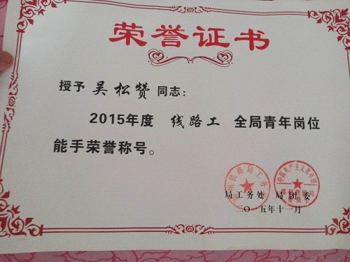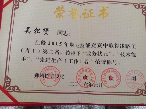 吴松赞,男,汉族,27岁,中共党员,2012年毕业于我系铁道工程专业,现就职于郑州铁路局郑州桥工段,于2014年元月1日起任郑州桥工段下行线路车间班长。 在校期间曾获院“三好学生”、“优秀毕业生”等称号。就职以来,先后荣获单位2012年度、2013年度“青年突击手”称号,荣获2015年度“业务状元”、“技术能手”、“先进工作者”称号,在郑州铁路局2015年青工比武中获得第二名,被评为全局线路工“青年岗位技术能手”。