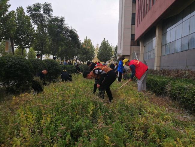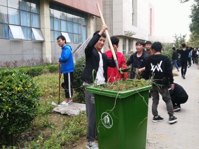 为美化校园环境,10月25日铁道工程学院于六号楼和七号楼之间组织校园锄草义务劳动。铁道工程学院大一学生积极参与。