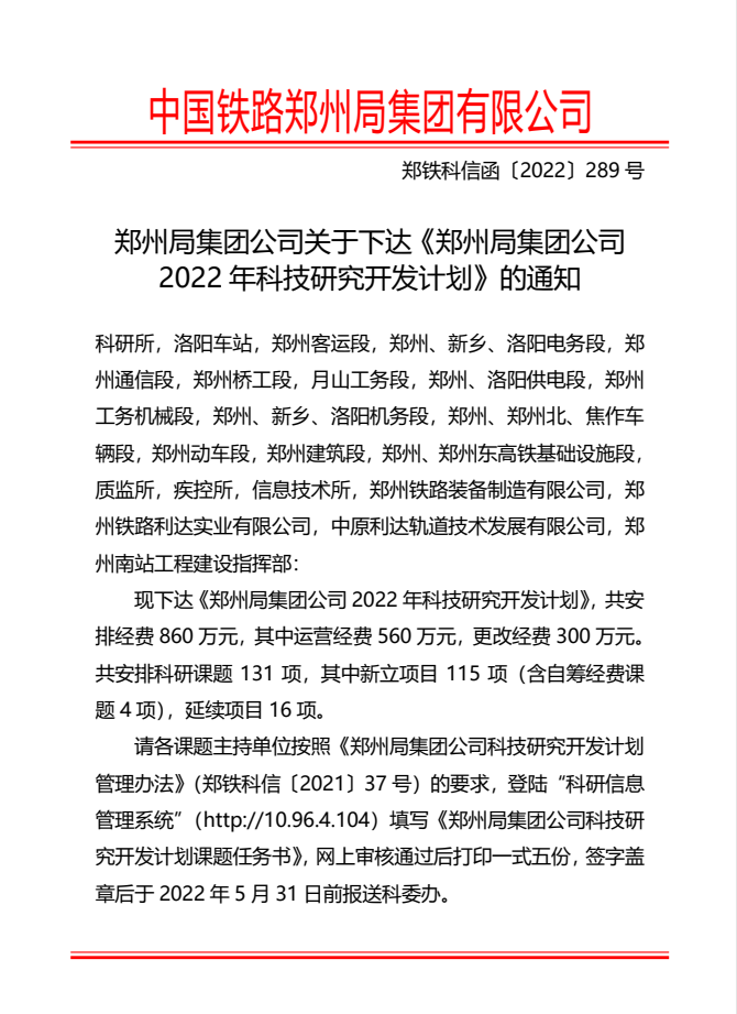 近日,中国铁路郑州局集团有限公司下达《郑州局集团公司2022年科技研究开发计划》(郑铁科信函〔2022〕289号),我校作为合作单位成功立项7项。