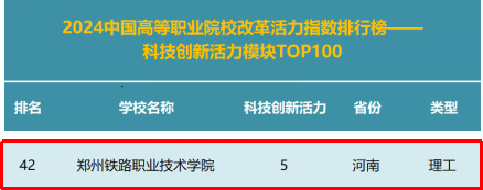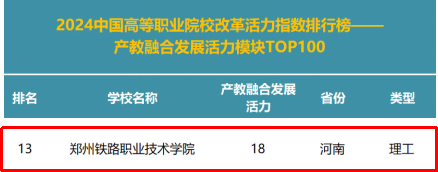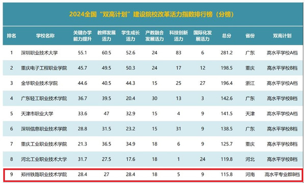 学校在各个分榜中均有出色表现:在2024全国“双高计划”建设院校改革活力指数排行榜(分榜)中位列第9位、在2024关键办学能力提升模块排行榜中位列第16位、在2024教师发展活力模块排行榜中位列第16位、在2024学生成长活力模块排行榜中位列第7位、在2024产教融合发展活力模块排行榜中位列第13位、在2024科技创新活力模块排行榜中位列第42位、在2024国际化发展活力模块排行榜中位列第52位。