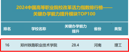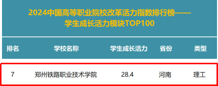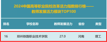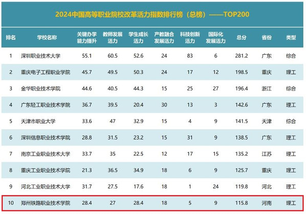 近日,高职发展智库正式发布“2024中国高等职业院校改革活力指数排行榜”(以下简称“活力指数排行榜”)。学校在活力指数排行榜(总榜)中以总分115.8分,位列全国第10位,本次排名是对学校在整体实力和改革活力的高度认可。