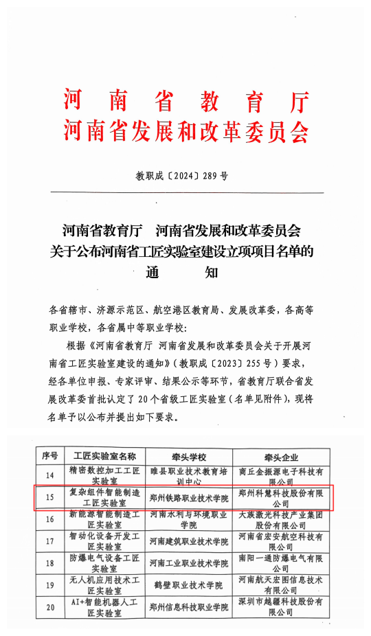 近日,河南省教育厅、河南省发展和改革委员会发布了《关于公布河南省工匠实验室建设立项项目名单的通知》(教职成〔2024〕289 号),我校复杂组件智能制造工匠实验室获批河南省首批工匠实验室建设项目。