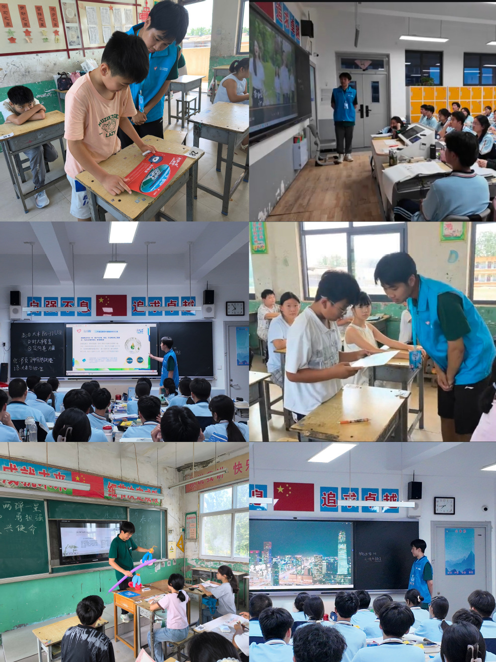 活动中,不少同学在笔记本上认真记录感悟,写下“以先辈为榜样,勇担科技报国使命”的誓言。而在周口市钱店镇大庄村小学,团队则以趣味互动激发孩子们的兴趣:通过动画短片将“原子弹、氢弹、人造卫星”的概念转化为生动故事,再手把手指导孩子们用气球编出火箭模型。
