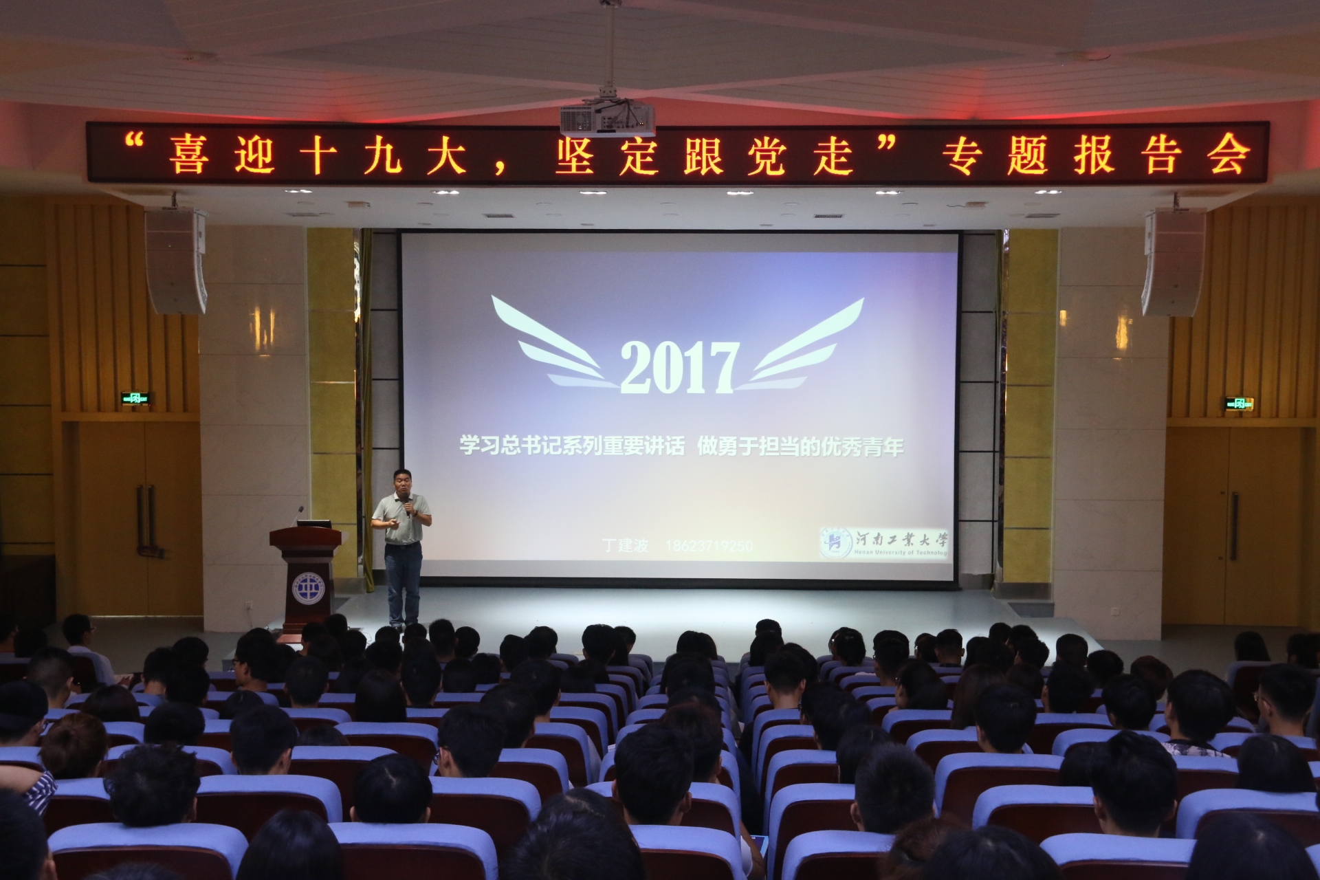9月26日,校团委主办的“喜迎十九大,坚定跟党走” 报告会在第二报告厅举行,河南工业大学教授、马克思主义哲学博士丁建波应邀来校做主题报告。我校师生代表300余人参加了报告会。