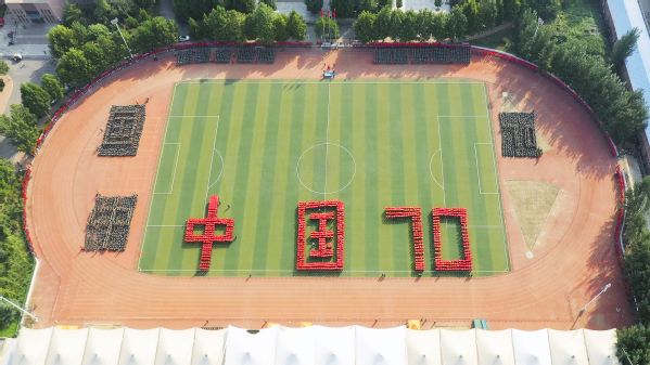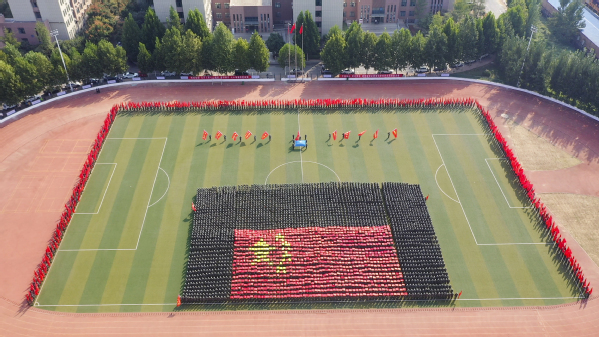 由1086名郑铁学子组成的队形变化方队,意气风发,身姿矫健,如腾飞的巨龙,以奔腾之势汇聚成“1949-2019”、“中国70”、“五星红旗”、并道铁轨等图案字样,书写着共和国70年的沧桑巨变,展现着共和国70年的日新月异,歌颂着共和国70年的繁荣富强。