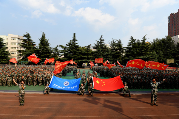 红旗飘扬,如似火年华,如胜利凯歌,红旗方队表演中,一面面“奔跑”的红旗迎风招展,猎猎作响,象征着铁院学子血液里迸发的澎湃热情,为军训会场打亮了鲜艳的底色。
