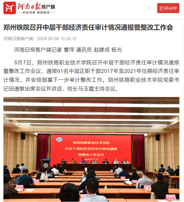 2024年5月8日,河南日报客户端发布新闻《郑州铁院召开中层干部经济责任审计情况通报暨整改工作会》,详细报道了我校首次中层干部经济责任审计情况通报暨整改工作会的相关开展情况。