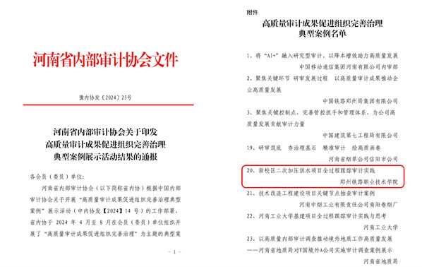 此次评选活动由河南省内部审计协会主办,旨在表彰和推广全省内部审计机构在打造高质量审计成果、促进组织完善治理方面的典型经验和实务。经过专家组的严格评审程序,我校《新校区二次加压供水项目全过程跟踪审计实践》案例展现了在新校区建设过程中,二次加压供水项目通过全过程跟踪审计,有效控制项目成本、提高资金使用效率、确保工程质量的实践成果。这一案例体现了我校内部审计工作的专业性和高效性,以其创新性和实践价值脱颖而出,成为获奖案例之一。