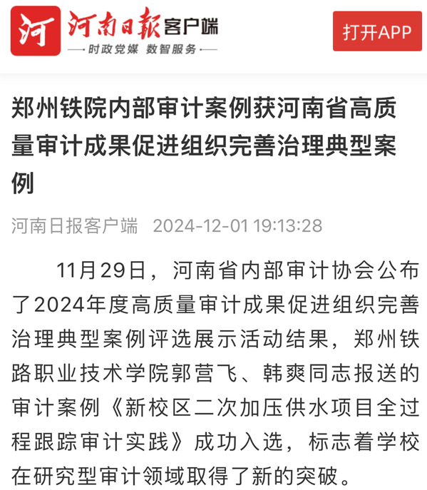 12月1日,河南日报客户端发布新闻《郑州铁院内部审计案例获河南省高质量审计成果促进组织完善治理典型案例》,详细报道了我校审计处郭营飞、韩爽同志报送的审计案例《新校区二次加压供水项目全过程跟踪审计实践》成功入选河南省内部审计协会评选的2024年度“高质量审计成果促进组织完善治理典型案例”。