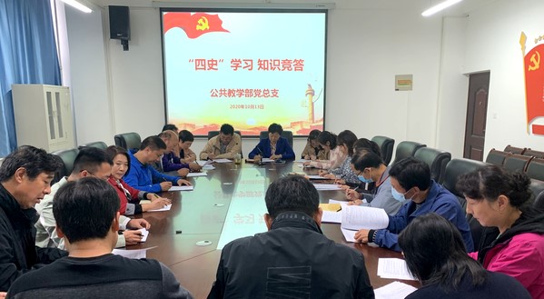 为深入学习贯彻习近平总书记关于学习党史、新中国史、改革开放史、社会主义发展史的有关讲话精神,增强“四个意识”,坚定“四个自信”,从历史中汲取精神力量、汲取经验智慧、汲取坚守人民立场的定力,始终保持“为人民服务”的宗旨,立足岗位,立德树人、教书育人。10月13日,公共教学部党总支举行“四史”学习知识竞答主题党日活动,全体党员参加了竞赛答题活动。