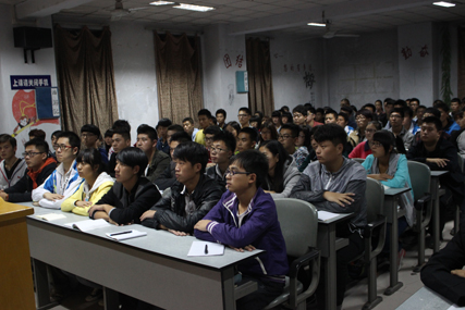 中午十二点半,一百多名由各班挑选出的同学已整齐坐好,曹书记走上讲台,同学们报以热烈的掌声。接下来书记向同学们讲述了党的性质、宗旨等内容,并举了一些事例便于同学们更透彻地了解党组织。期间,书记重点强调了入党要端正心态,不能带有功利心,要有为人民服务、为祖国献身的大无畏精神。同学们表情严肃,认真聆听并做好笔记,遇到疑惑的地方及时向书记提出疑问。书记耐心解答问题并为同学们分发党章,现场气氛十分融洽。