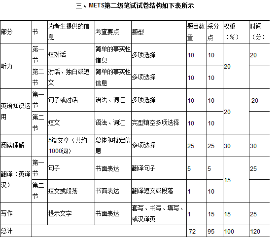 全国医护英语水平考试是非学历性教育考试。考试的目的是考查考生医护英语实际应用和交际能力。其考试性质为标准参照性考试。METS第二级考试的笔试使用英文指导语。
