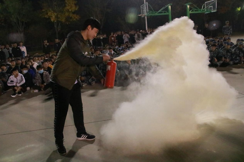 按照预定方案,各军训方队在预定场地准时集合。先是由军训负责人为21级新生们进行消防安全知识的讲解,如要保持良好的消防安全习惯,禁带火种进宿舍楼,在面对火灾时要保持冷静不慌乱,第一时间采取正确的求救、自救措施等;随后,由退伍消防兵教官向新生们讲解火灾现场的应急处理方案、灭火器的种类和灭火原理及相关注意事项等内容,并亲自演示灭火器的使用方法。经过教官的讲解与演示,21级新生代表根据所掌握的灭火器使用步骤和方法,成功打开灭火器,达到了冷静沉着面对突发情况,成功快速扑灭火情的消防标准。