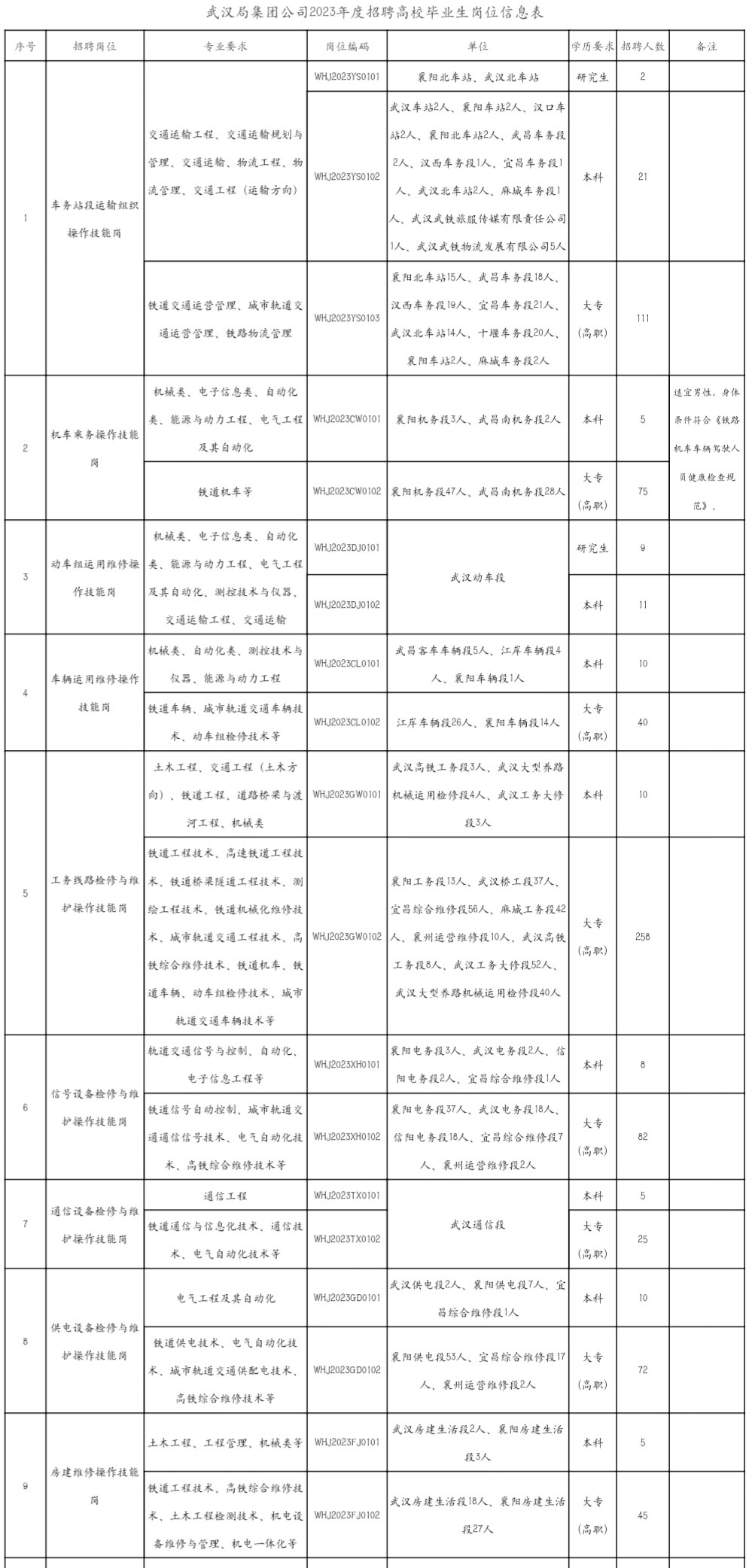 中国铁路武汉局集团有限公司根据经营发展需求,拟招聘普通高等院校大专(高职)及以上学历毕业生,现将有关事项公告如下: