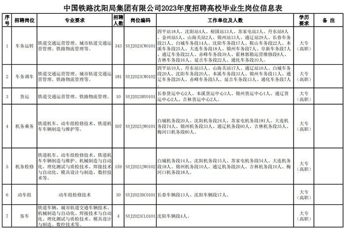附件:中国铁路沈阳局集团有限公司2023年度招聘高校毕业生岗位信息表.