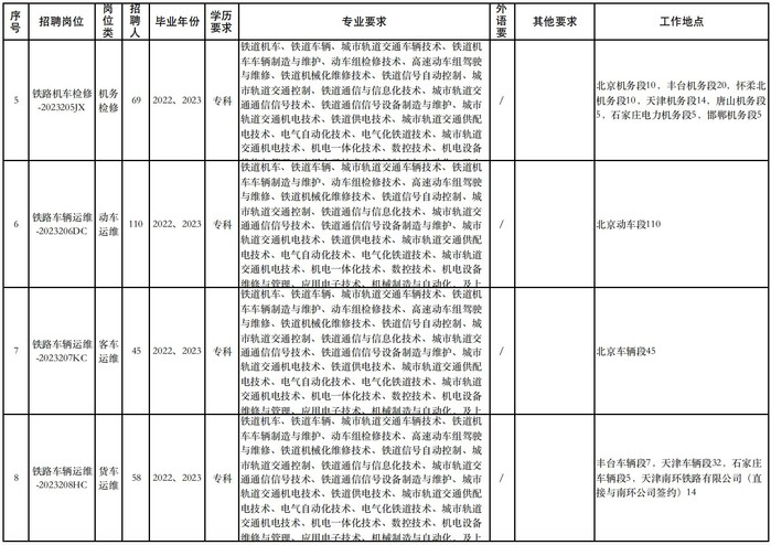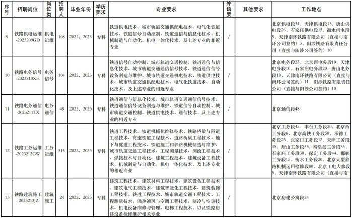 中国铁路北京局集团有限公司根据企业发展需要,招聘普通高校大专(高职)学历毕业生。具体事宜公告如下: