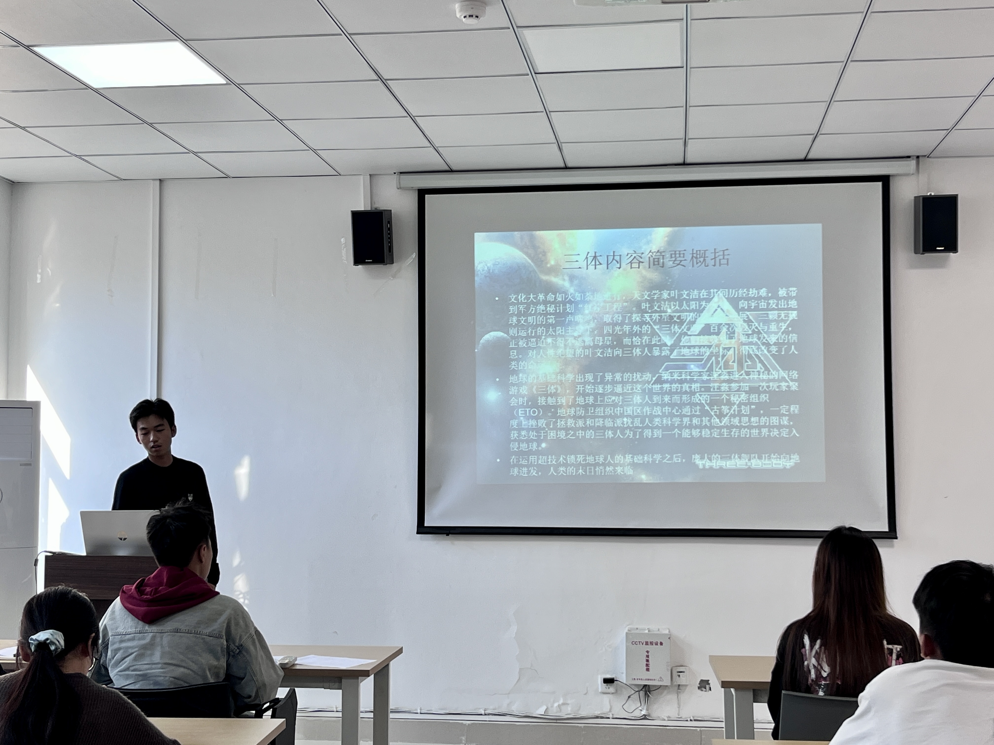 10月22日晚,学风建设服务部举办多场观影会,播放《三体》相关影视作品,让同学们通过视听艺术了解、品味《三体》,为本书的阅读、交流作了良好铺垫。10月24日上午,组织举办了晨读会,大家朗读书中精彩段落,用心感受书中富含的情感与哲思。10月24日下午,举办了本次活动的尾章——交流会。共13名同学积极报名参加交流,他们结合多媒体、背景音乐等,通过朗诵、话剧等多种形式向大家分享和交流了他们对《三体》这本书的理解与思考。互动环节中主持人提问了关于《三体》的相关问题,同学们积极回答,让分享会变得有趣起来。