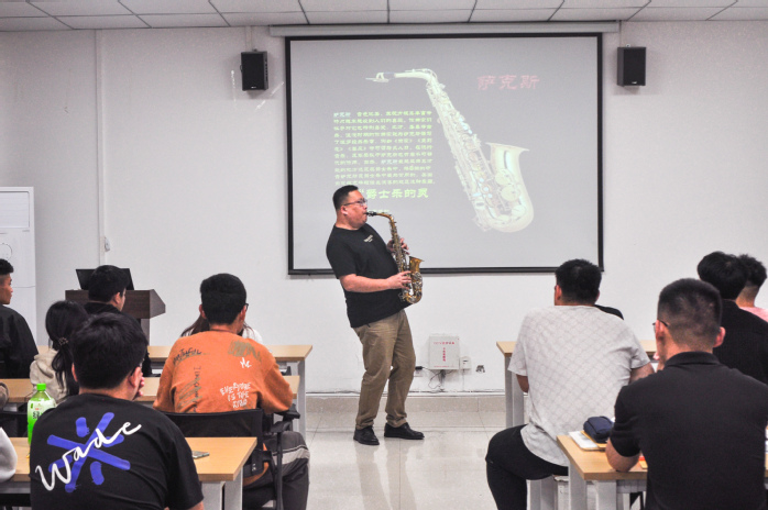 张晓远先是向大家介绍了军乐和军乐团的基础知识,然后又结合自身经历,向大家介绍了西洋乐器的基本分类、军乐团的不同声部及声部间的配合演奏等内容。然后,他从专业的角度,结合“拟人”的称谓,向同学们分别介绍了常见木管、铜管和打击乐器的名称、特点和作用,大家很快就有了深刻印象:小号是“王子”、圆号是“女神”、长号是“将军”、大号是“宰相”……在介绍到木管乐器中的“萨克斯风”时,张老师在现场进行了实物展示和示范演奏。讲座又通过视频的方式向大家展示了各种乐器的音色、互相配合演奏时的效果、指挥的重要性等,现场展示激发了听众的极大兴趣,讲座取得了良好效果。