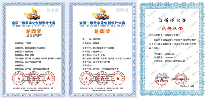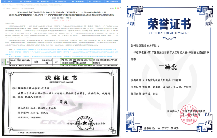 我通过参加创新创业类比赛,提高自己的创新探索能力、实践能力,目前斩获国家级奖项4项、省级奖项8项、校级荣誉2项,具体为2023年第九届中国国际大学生创新创业大赛国家铜奖、2023年第16届全国3D大赛年度总决赛全国二等奖、第二十四届中国机器人及人工智能大赛国家三等奖、第五届国际青年人工智能大赛国际一等奖、第五届国际青年人工智能大赛中国赛区国家二等奖、2023年河南省互联网+大学生创新创业大赛赛道省级一等奖、第十三届蓝桥杯软件开发和信息技术专业人才大赛省级三等奖、第九届河南省机器人竞赛省级一等奖等。这些荣誉的背后是我对技能的不断磨练和对创新的不懈追求,同时也是我团队合作和沟通能力的体现。
