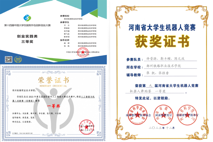 课余时间,我积极参加学校的无线电协会,成为协会的核心成员之一。在协会中,我主动学习实用技能知识和创新创业方面的知识,不断提升自己的专业技能和创新能力。我积极参加各类创新创业实践类比赛,想在比赛中取得优异的成绩,就必须要付出超乎常人的精力与时间。在中国国际“互联网+”大学生创新创业大赛的这场持久战中,我与队员们一起熬夜修改文档、PPT,在没有思路时相互鼓励,不放弃,不摆烂,最终获得了第九届中国国际“互联网+”大学生创新创业大赛国家铜奖一项;在中国大学生服务外包创新创业大赛中,我与队友们远赴无锡,为了提高项目质量,我与团队成员不断打磨PPT与计划书,进行多次项目路演,最后获得了国家三等奖的好成绩;在第九届河南省大学生机器人竞赛中,我认真比赛,刻苦钻研,将自己在生活中的一些灵感以及想法融入作品中,并凭此荣获第九届河南省大学生机器人竞赛河南省级一等奖。我通过参加创新创业类比赛,提高自己的创新探索能力、实践能力,目前斩获国家级奖项5项、省级奖项12项、校级荣誉4项,具体为2023年第九届中国国际大学生创新创业大赛国家铜奖、2023年第16届全国3D大赛年度总决赛全国三等奖、第十四届中国大学生服务外包创新创业大赛国家三等奖、第二十四届中国机器人及人工智能大赛国家优秀奖、第五届国际青年人工智能大赛国际一等奖、第五届国际青年人工智能大赛中国赛区国家二等奖、2023年河南省互联网+大学生创新创业大赛赛道省级一等奖、2023年河南省互联网+大学生创新创业大赛赛道省级二等奖、2023年河南省互联网+大学生创新创业大赛赛道省级三等奖、第十三届蓝桥杯软件开发和信息技术专业人才大赛省级三等奖、第九届河南省机器人竞赛省级一等奖等。这些荣誉的背后是我对技能的不断磨练和对创新的不懈追求,同时也是我团队合作和沟通能力的体现。