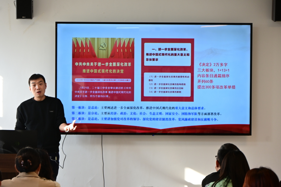 为深入学习领会党的二十届三中全会精神,进一步凝聚改革共识、汇聚改革力量,以更加昂扬的奋斗姿态推进书院学生管理工作高质量发展。10月23日下午,丝路书院在三楼讲堂开展了学习宣传贯彻党的二十届三中全会精神宣讲报告会。本次报告由马克思主义学院副教授高文天作题为《进一步全面深化改革开辟中国式现代化广阔前景》的专题讲座,全体育人导师及学生代表参加。
